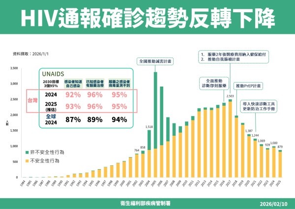 依據疾管署監測資料顯示,2025年新增確診通報本國籍愛滋病毒感染人數為879人,創2004年以來新低;而有關聯合國愛滋規劃署(UNAIDS)2030年「95-95-95」愛滋防治目標,即95%感染者知道自己感染、95%已知感染者接受治療、以及95%接受治療者病毒量成功抑制,我國2025年預估可達「93-96-95」,惟仍有約7%愛滋感染者尚未知自身已感染